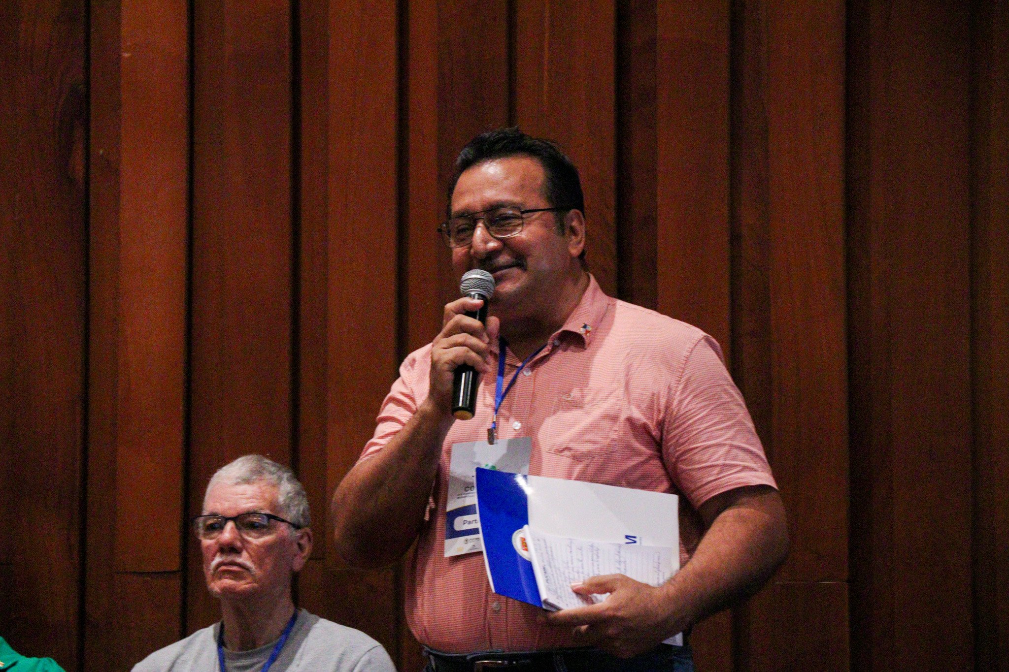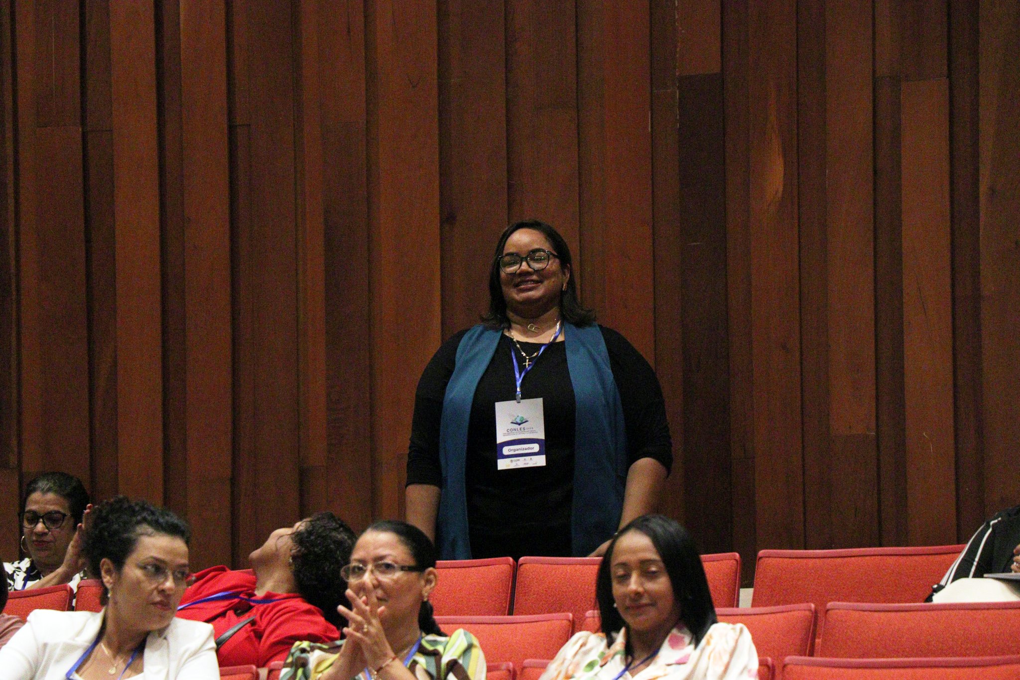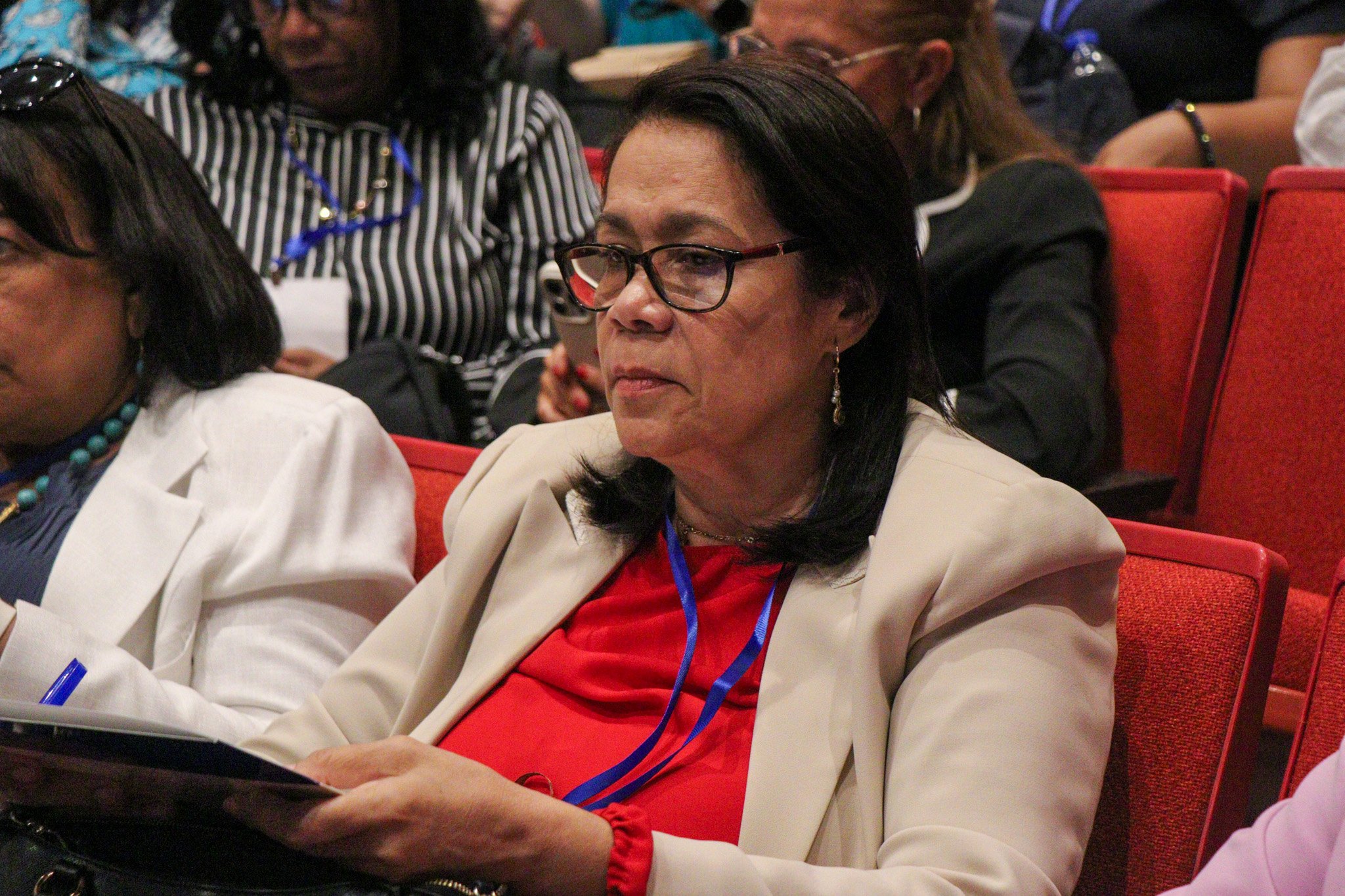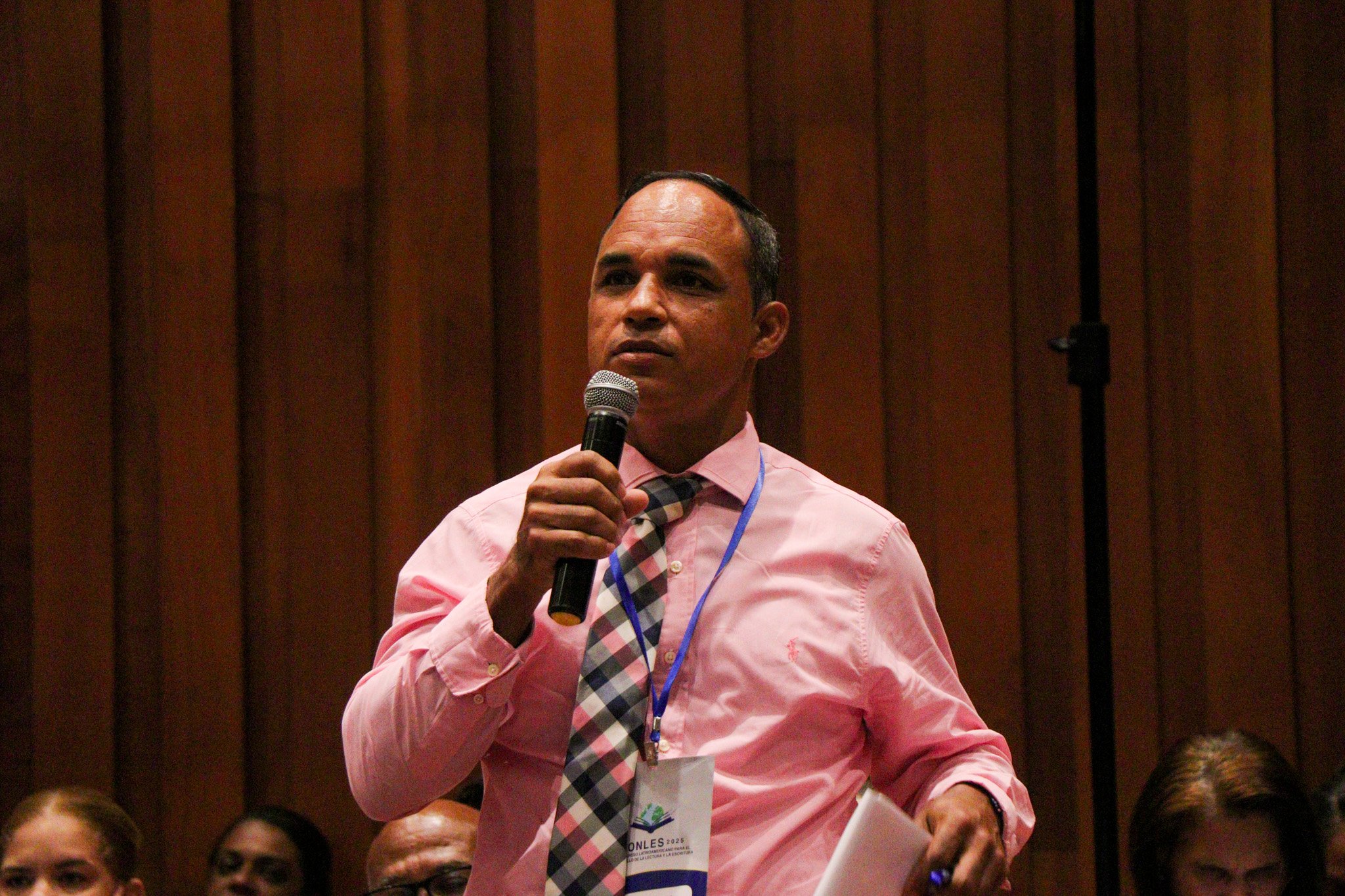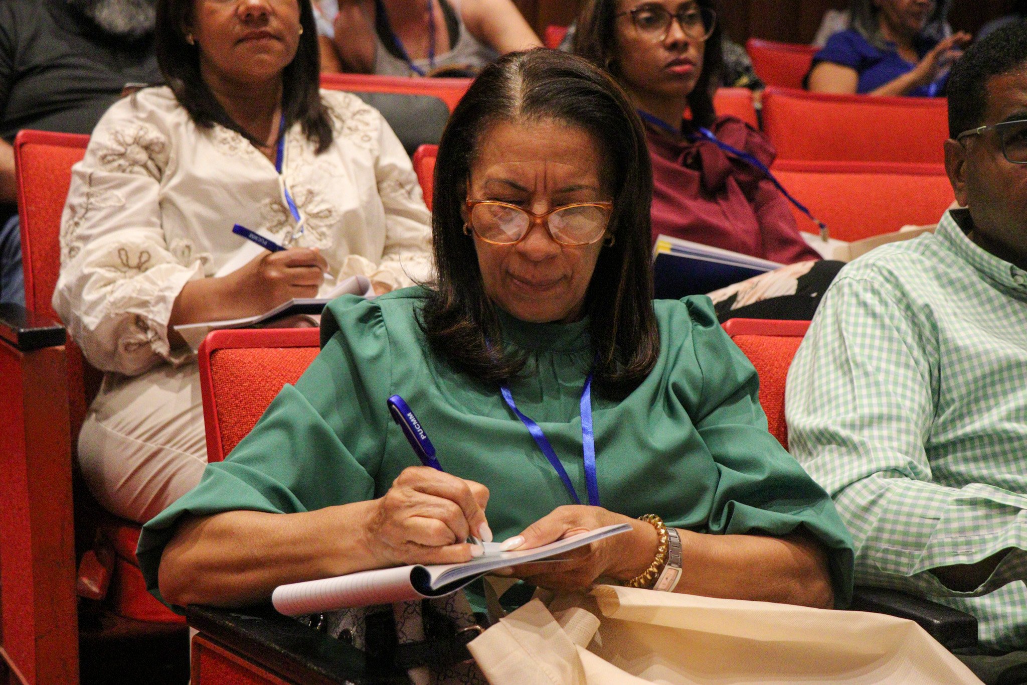 Un chofer con un cartel que dice: PUCMM/CONLES 2025 esperará a los participantes que han comunicado su deseo de transportación y los conducirá a sus hoteles en Santiago.